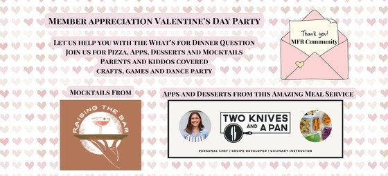 Hi Members, We appreciate you.  Love is in the air! Let's celebrate it! The MFR will be hosting a Member Appreciation Valentine's Day party on Friday, February 9th at 5 p.m. We'll have pizza, snacks and heart themed crafts.  We have generous support from local companies for some parent treats and mocktails!  Two Knives and a Pan can help answer that dreaded question of What's for dinner? They are a local meal delivery service and you can try some of their appetizers and desserts.  Have you done dry January? Keep it going with Raising the Bar's elevated mocktails.  Try them out at our event and you can sign up for monthly box kits delivered to your door.  Please RSVP so we know how much food and drink. Also, if you are still looking for an easy way to finish off that volunteer requirement, we may have some light clean up after the party, please email us at events@melrosefamilyroom.org. This is an appreciation of our community event so if it doesn't sound fun, then just join us for what does! Sending some February love your way.